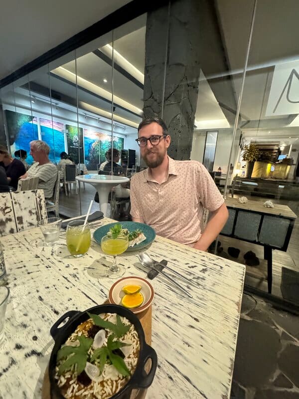After checking into our hotel, we walked down to the pier and, within minutes, were completely surrounded by sea lions. Like, they were everywhere—on benches, sidewalks, the middle of the road—you name it! Some were peacefully napping, others were loudly barking at each other, and a few definitely looked like they were plotting against us. It was absolutely surreal. We spent the afternoon wandering the island, eating delicious ceviche loaded with fresh shrimp and lime, and getting fitted for wetsuits for our big 360° tour the next day. That night, we had dinner at Muyu Galápagos, a farm-to-table spot that was perfect for a romantic night out. Highly recommend!