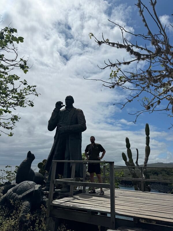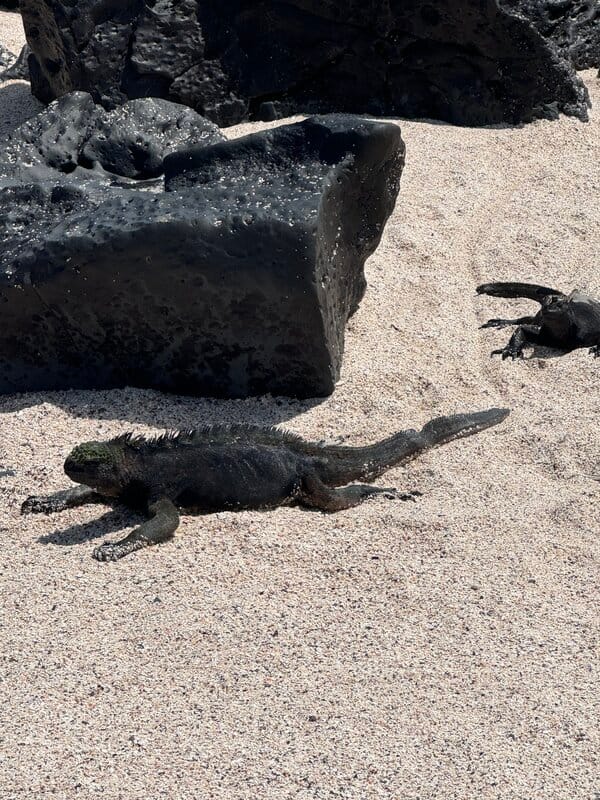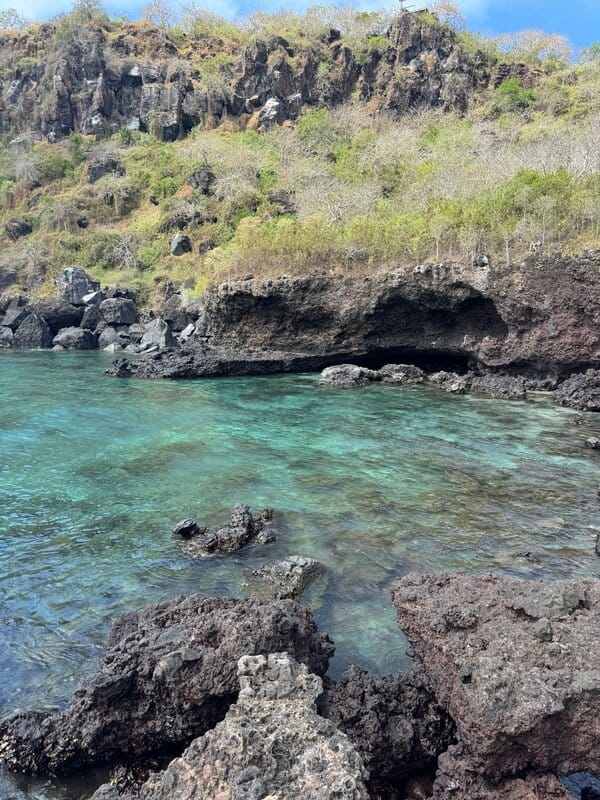 Next, we started the self-guided walking tour at the Centro de Interpretación Ambiental, where we learned all about the Galápagos. We stopped at Muelle Tijeretas, where we found an amazing swimming spot with a pier to jump off of. We also saw the Charles Darwin Monument, followed by Playa Punta Carola, where marine iguanas were sunbathing on the sand. That night, we went back to our favorite restaurant and I had the best octopus dish ever, served in a volcanic stone—perfection!