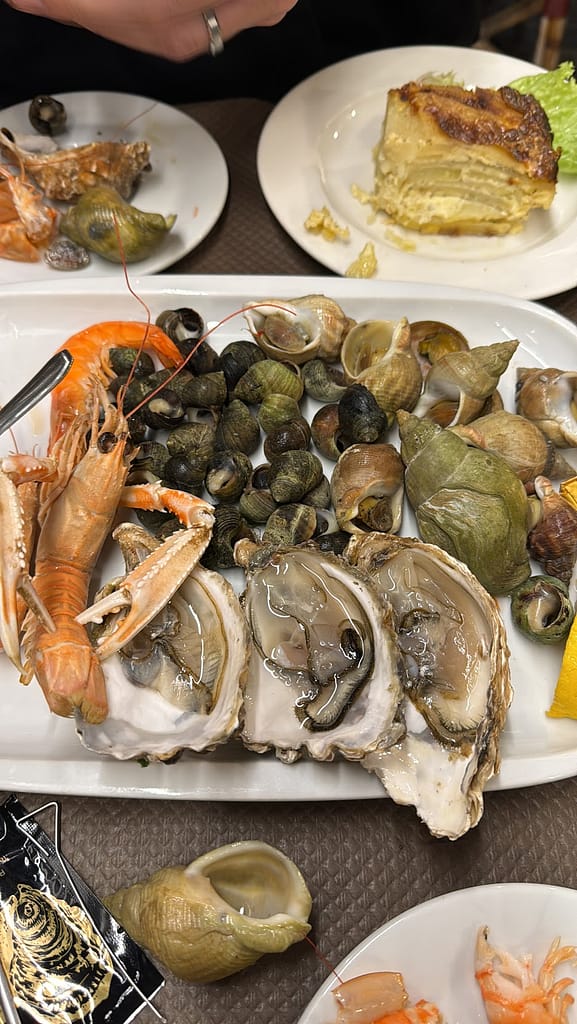 We stopped at Honfleur for dinner and were pleasantly surprised with the service, quality, and the night views of the port. Our dinner consisted of a seafood platter, which was mainly oysters and all kinds of escargot! We truly enjoyed it, and I couldn’t pass up a crepe for dessert. I had seen online a Tesla charging center, so I asked Ricky to swing by, and lo and behold, we could use it for our car. It was extremely fast and much cheaper. This became our go-to charging area. They do say the third time is the charm. An extra plus was that it was right next to the outlet stores, and I got some retail therapy done while the car charged each time.