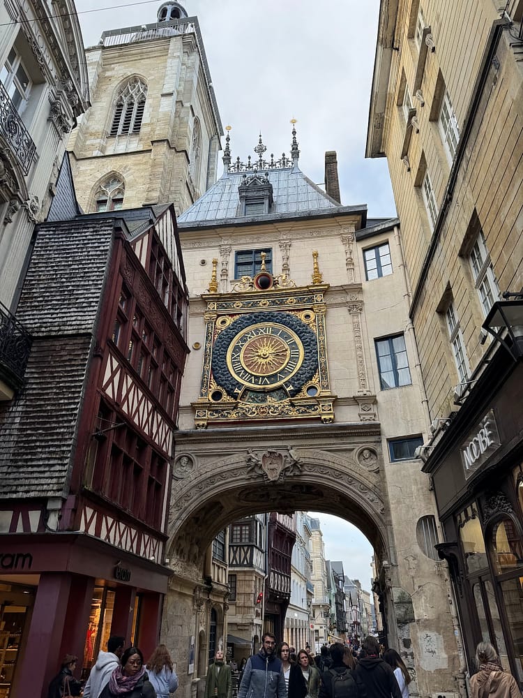 We allocated half a day for Rouen, which was ample for us. Our first stop was Rouen’s own Notre-Dame Cathedral; like most cathedrals of its age, it was truly magnificent. We then walked to Le Gros-Horloge, a 14th-century astronomical clock in Rouen. This city clock, one of my personal top three highlights, displays the day of the week, the lunar phase, and the time. Installed in a Renaissance arch crossing the Rue du Gros-Horloge, its mechanism is one of the oldest in France, dating back to 1389. The view from the top of the clock, offering a panorama of the entire city, is absolutely stunning.