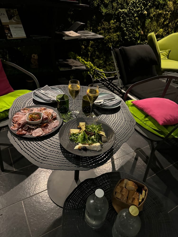 We had spa reservations at Les Jardins de Coppelia that night. After leaving Honfleur, we drove straight to the spa, which was only about a 10-minute drive away. Aline’s doesn’t have a spa facility, but they have arrangements with Les Jardins de Coppelia, which allowed us to get a great deal. We paid approximately 300 euros to book the ENTIRE spa facility (a possibility we hadn’t even considered) for three hours. This included a 30-minute couples massage, plenty of time in the Hammam and sauna, and complimentary dinner, dessert, and champagne. If you’re a fan of spas and massages like us, make sure to schedule a treatment here when you’re in the Normandy region—it gets a perfect rating from us.